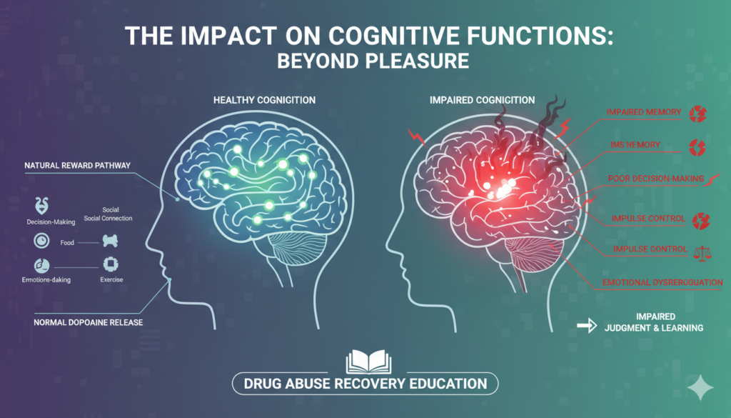 The effects of drugs extend far beyond the reward system. They significantly impair critical cognitive functions, impacting an individual’s ability to think, learn, and make decisions.